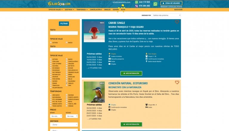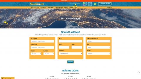 Completo buscador y filtrado de viajes en la propia página de resultados, donde se pueden filtrar por más de 10 variables como el destino, tipo de viaje, fechas y duración, temporada, precio o texto libre.