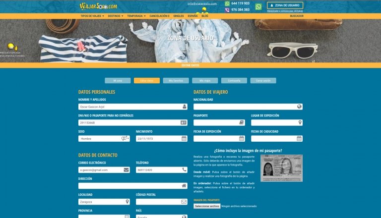 Zona de usuario donde cualquier cliente puede gestionar sus propios datos, como el envío de documentación: Documentos de identidad, pasaporte. O incluso contar una sección de Viajes favoritos donde almacenar sus preferencias.
